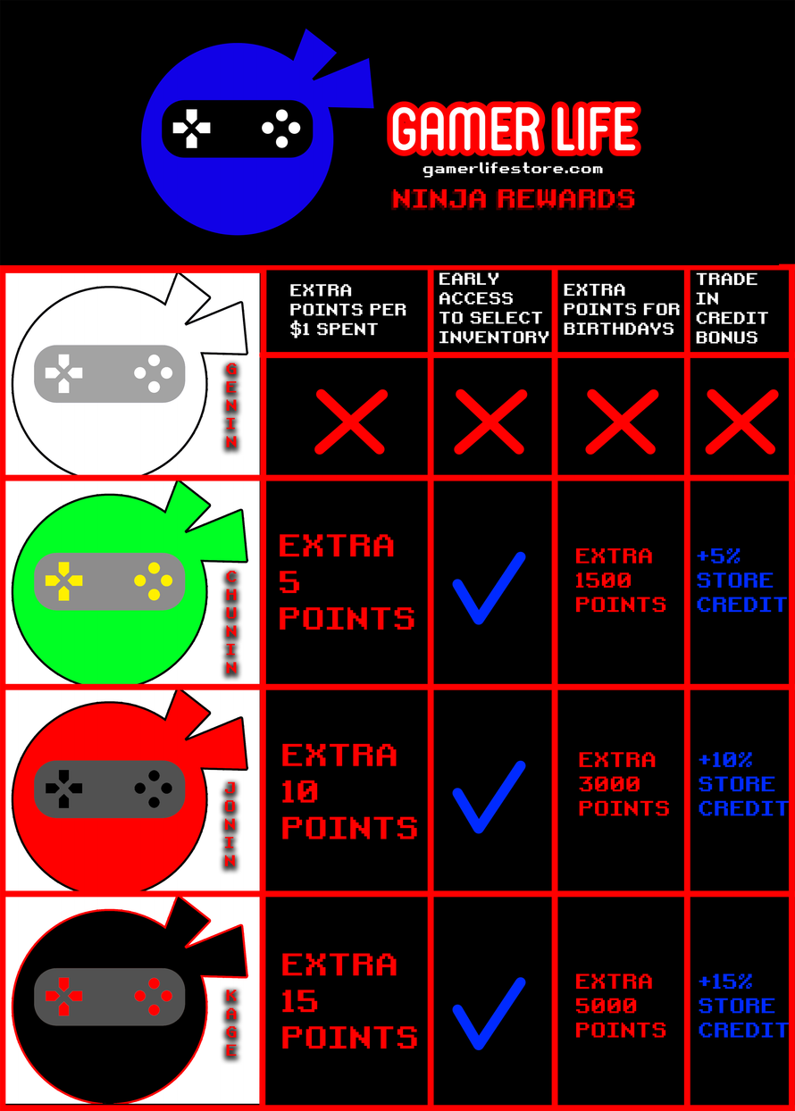 Accumulate points through purchases (20 points per $1 spent), social media actions, product reviews, referrals, and birthdays to get discounts on future purchases. Total annual point accumalation also can level up your Ninja Rank. The higher the rank, the more benefits and perks you receive.