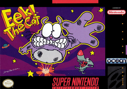 KOOM-BY-YAH! Hold on tight for hair-raising adventure with your favorite Saturday morning superhero - in his Super NES debut. Now you can play with EEK! every day of the week!!! Get zapped, bonked and splattered through six hilarious adventures as you try to rescue Annabelle from loony aliens... Reunite Pierre with his Squishy Bear brothers... Save a sleepwalking granny from a zoofull of accidents... Catch Joey the orphan's runaway Christmas present... And put your tail on the line nine times against Sharky the sharkdog... EEK! THE CAT! You're in trouble now!