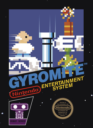You'll need R.O.B. - the world's first Robotic Operating Buddy - to play this action-packed game! You've got to keep R.O.B.'s gyroscope spinning in order to help a mad scientist deactivate all the dynamite in his laboratory. You'll move columns up and down to speed the scientist on his way while trying to avoid the lethal Smicks. And you'll get him to his dynamite even faster if you can get R.O.B. to spin two gyros at the same time! But don't take your eyes off the scientist, because anything can happen in GYROMITE! Where two hands and one pair of eyes aren't always enough!