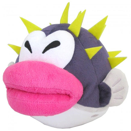 Porcupuffers (called Porcu-Puffers in Super Mario World) are a species of Cheep-Cheeps that first debuted in Super Mario World. They resemble giant blue-purple Cheep-Cheeps with big red lips and blue spikes all over their back. Their name is a portmanteau of "porcupine " and "puffer fish ".