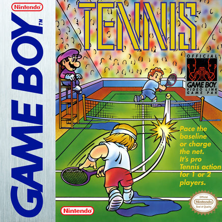 Tennis for the Game Boy lets you use your racket to volley, stroke, smash and serve the ball. Be careful not to hit the ball over the sideline or baseline or into the net. To carefully place your shot, you can hit the ball left or right, weak or strong, and deep or short. When the ball is hit above your head, your stroke automatically becomes a smash. There are four skill levels to choose from. The higher the difficulty level, the faster the players and the ball move. The computer's judgment skills also improve with each increasing skill level. You can play against the computer-controlled opponent or challenge a friend via the link cable. Mario is on hand to call the close ones from a chair placed high above the action. Apparently plumbing is not his only occupation...