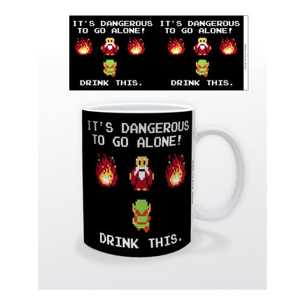 Here you go… drink this! This fun The Legend of Zelda Drink This 11 oz. Mug inspired by the perennially popular video game series bears the words "It's Dangerous to Go Alone! Drink This." along with images you'll recognize. Made of ceramic, the mug is dishwasher and microwave safe and comes packaged in an open-faced gift box. Don't head for Hyrule without it!