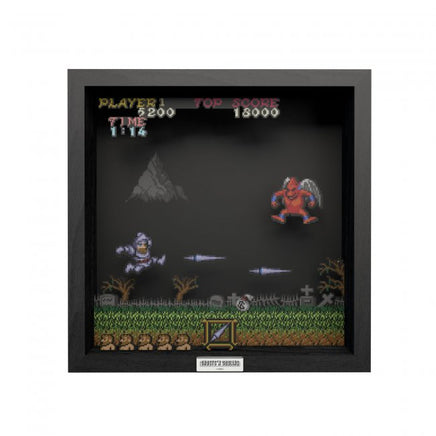 The demonic species of Red Arremers are one of the many monsters that terrorize Arthur during his long quest to save is damsel. Long mistaken to be a stage boss, this sky-diving creature will dive at you from side to side mercilessly. Display the most iconic moments of gaming with these officially licensed shadow boxes created to uniquely show your love of gaming.