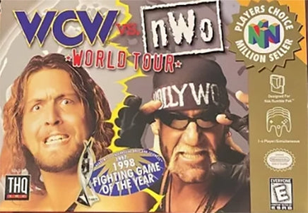 WCW vs nWo: World Tour is a professional wrestling video game released in 1997 for the Nintendo 64 game console. In addition to single, tag team, handicap, and battle royal, match modes not seen in future releases include a WCW versus nWo tournament, round-robin tournament, and league tournaments more familiar to Japanese wrestling. Unlike today's wrestling games, World Tour features no create-a-wrestler mode, story mode, or ring entrances and has a limited amount of actual WCW wrestlers. It also makes no reference to championship belts and, upon the successful completion of a tournament, shows an illustration of a fist raising a gold trophy. A championship belt creation feature was touted prior to the game's release, but this was ultimately scrapped.[3] Players can also attempt the "league challenge" in which a player must defeat several wrestlers from a given "promotion" in a row. Doing so allows a player to compete for that promotion's championship against a hidden character: Diamond Dallas Page (WCW), Wrath (DOA), Glacier (IOU), Randy Savage (NWO). Once a player has earned every championship they unlock "World Wide Wrestling" a longer challenge consisting of wrestlers from all four promotions. The championship match being against another hidden character: Joe Bruiser (a caricature of Muhammad Ali).