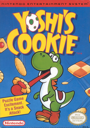 It's a puzzle game Yoshi-style in Yoshi's Cookie. Join Mario's dinosaur pal (as well as the world's most famous fictional plumber himself) as you try to match cookies of the same type into rows and columns, causing them to disappear. The cookies will fall from the top of the screen, and you'll have to shuffle around those that have already landed in order to succeed. The different shapes of cookies are heart, flower, diamond, check, circle, and a Yoshi shaped one, which can be used as a wild card (or "wild cookie," if you will). The game allows you to choose music, round, and speed.