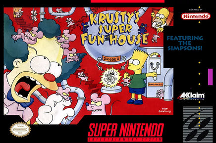 Hey kids! Give a hoot! Help out your old pal Krusty the Clown! My official Krusty's Fen House is infested with rats! There are over 60 levels in this game, and they're all crawling with the little varmints! I've got my loyal cadets, Bart and Home Simpson, Sideshow Mel, and Corporal Punishment to guard the rat traps, but I need you to lead the filthy rodents into those traps! Then we blow 'em up! We incinerate 'em! We laser-blast'em! We electrocute'em! We Krusterize the little stinkers!!! Hoo boy! Did I mention the snakes, aliens and the flying pigs? Well, watch out for those riffraff! If you can't Krusterize 'em, at least avoid 'em...they're worse than the #@!*%! rats! Making Krusty's Fun House vermin-free is not a pretty task, kiddy cadets--but someone's gotta do it!