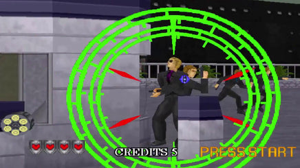 A variety of bad guys are armed with axes, knifes, pistols, grenades, machine guns, missile launchers, and more. A boss will mark the end of each stage and include mostly airborne (using jet-propelled packs) enemies who use missile and plasma attacks. By shooting various power-ups, players can acquire new weapons including rifles, automatics, machine guns, magnums, shotguns, and additional lives. Shooting a hostage will result in the player losing a life.